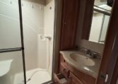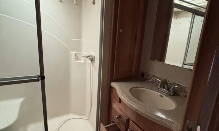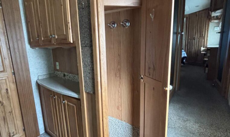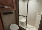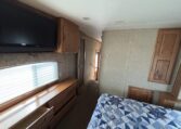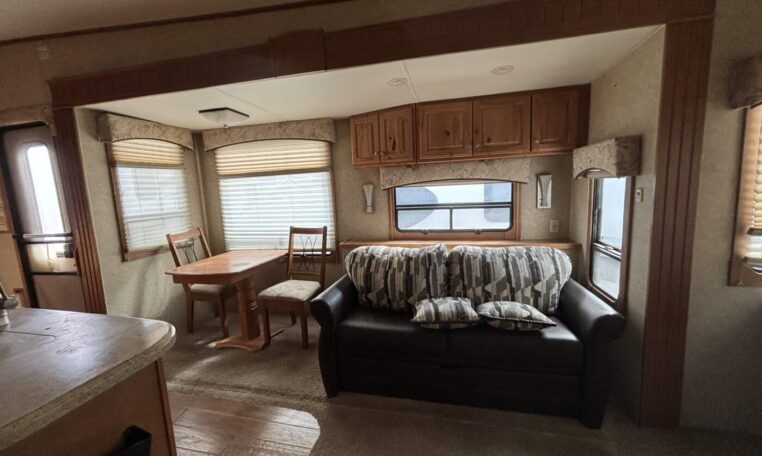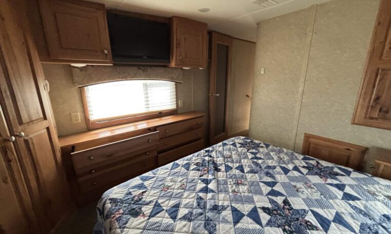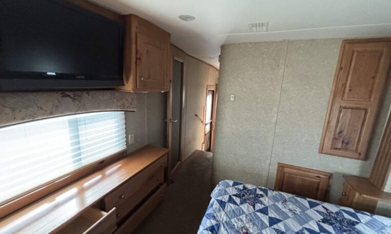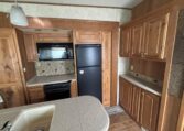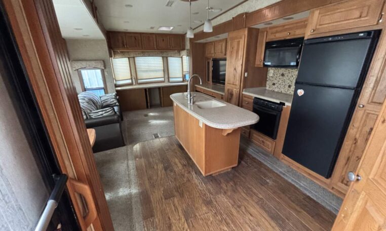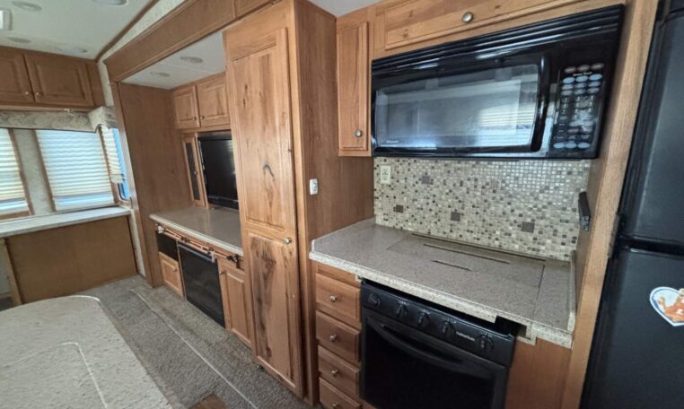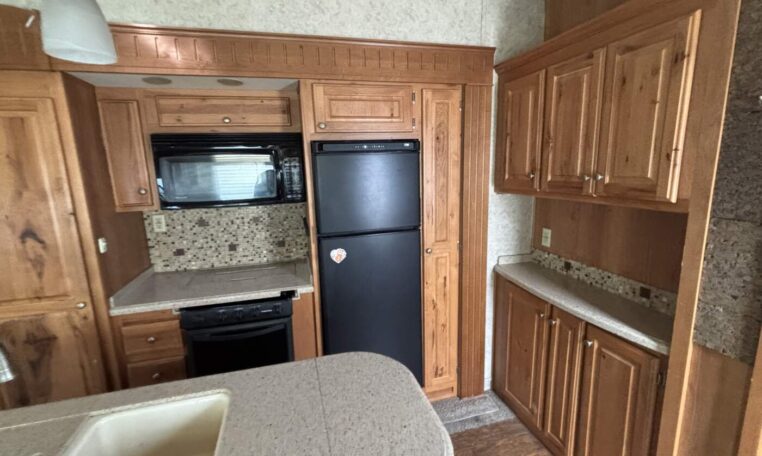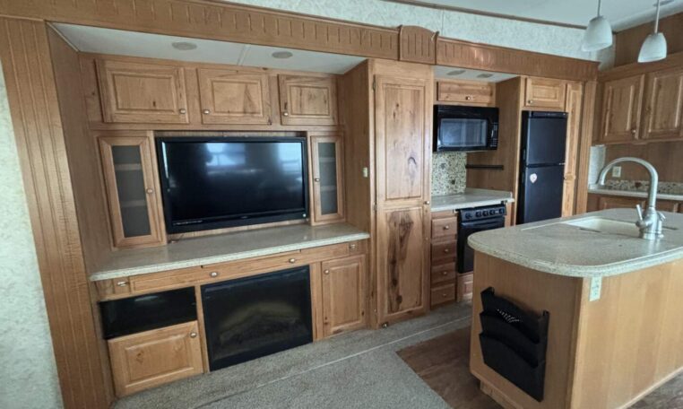This unit features a one-piece fiberglass roof for long-term durability and low maintenance, along with a true four-season build that’s designed to handle both summer heat and winter cold. Inside, you’ll find beautiful real hickory cabinetry throughout, delivering a warm, residential feel with solid craftsmanship you can see and touch.