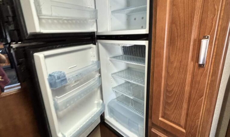 The kitchen is fully equipped with a 3-burner stove, oven, microwave, double-door refrigerator, and generous counter space—plus dual pantry storage for extended trips. The rear of the trailer offers a spacious full bathroom with a large shower, wardrobe, and extra storage—rare for a trailer in this size class.