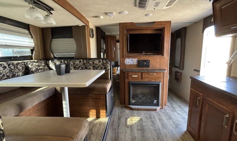 Inside, you’ll find a smart floorplan with a large slide-out that opens up the living space. The front private bedroom features a walk-around queen bed with plenty of storage, while the U-shaped dinette converts for additional sleeping—comfortably accommodating up to 4 people.