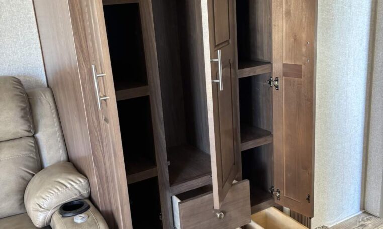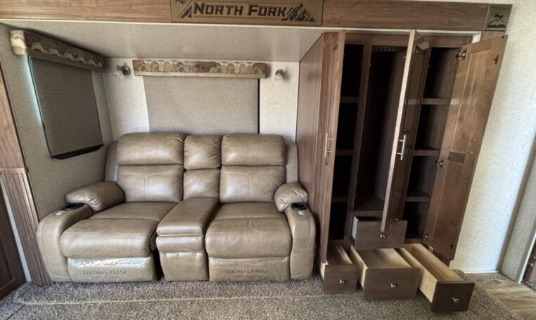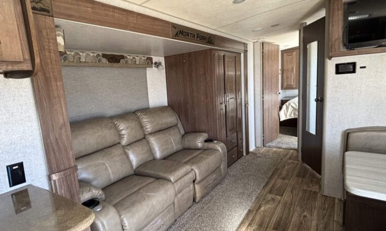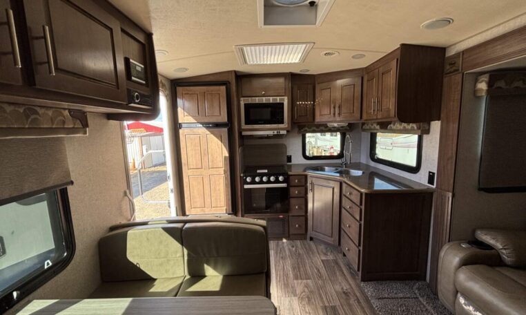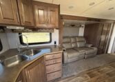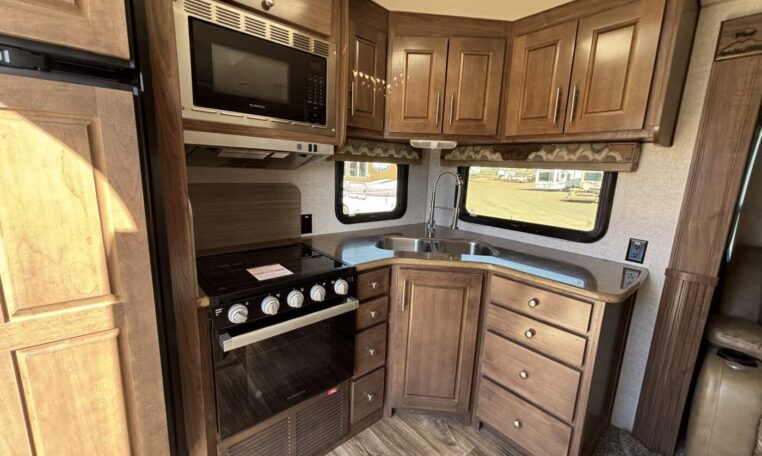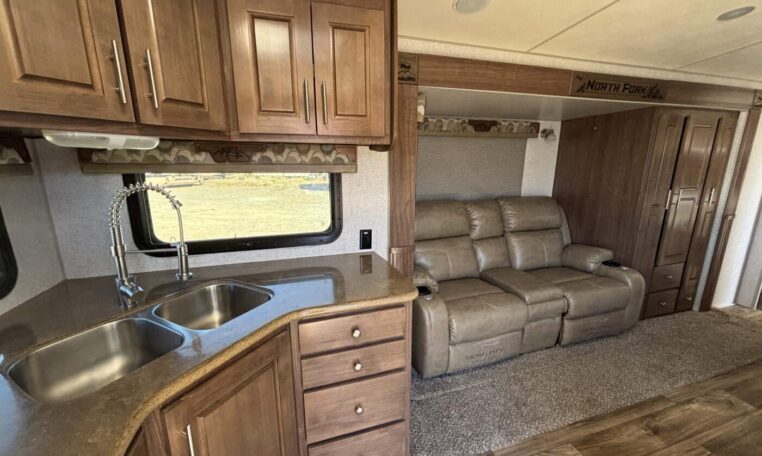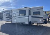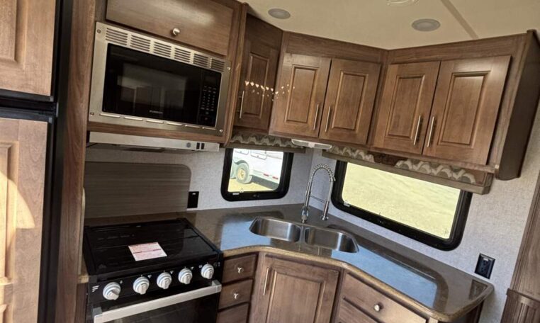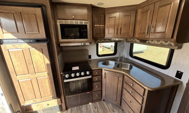 This well-designed trailer features a spacious rear kitchen, a large slide-out that opens the living area, and residential-style amenities throughout. From the solid-surface countertops and hardwood cabinetry to the high-quality insulation and structural integrity, every detail is built to perform and built to last.