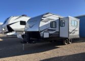This floor plan features the enclosed bathroom for additional leg room and privacy. This travel trailer is just under 30′ and has a gross weight rating of 10,000lbs, that’s fully loaded! This trailer is upgraded with the 15K A/C with ducting, 2″ Receiver hitch, Flxgaurd awning, and Cross-stitch sofa.
