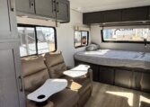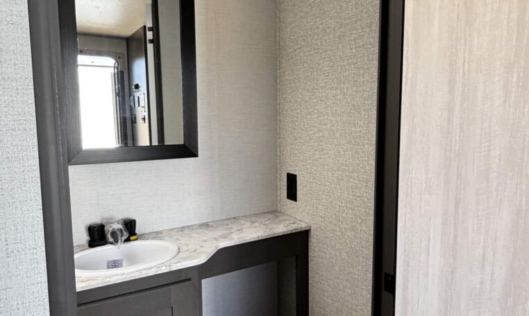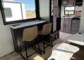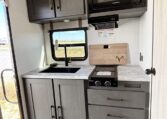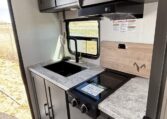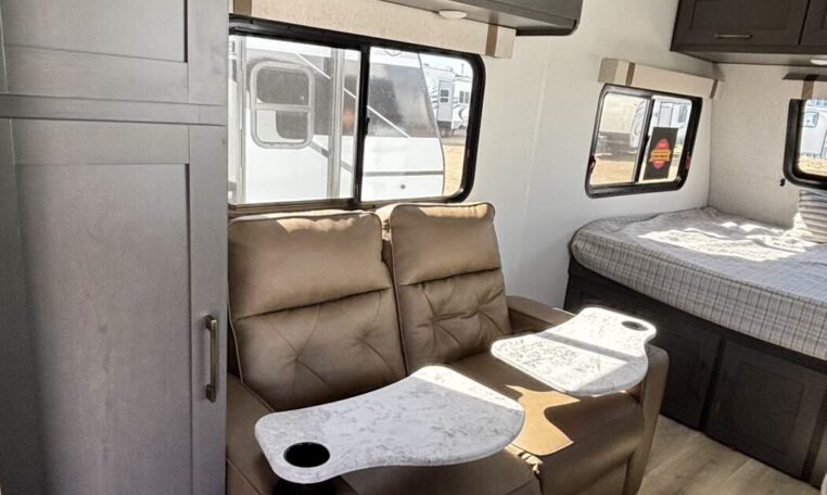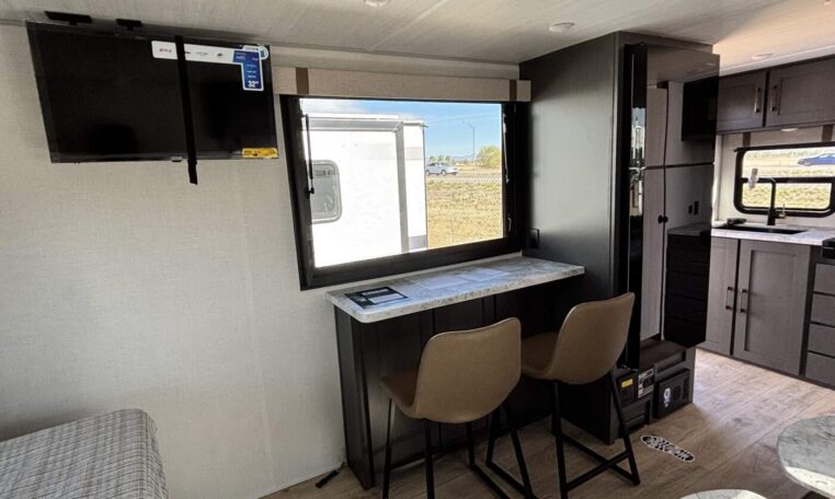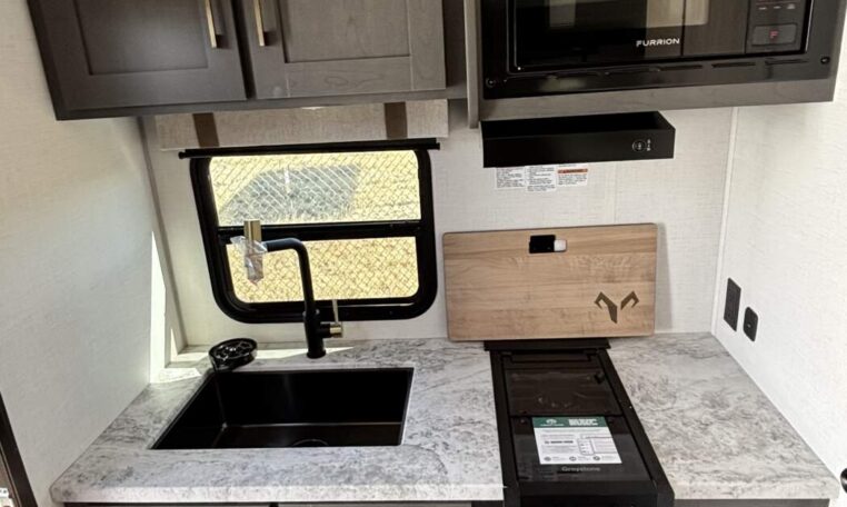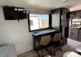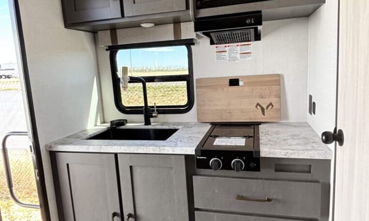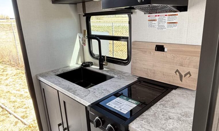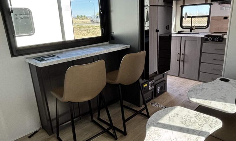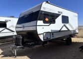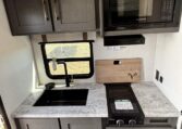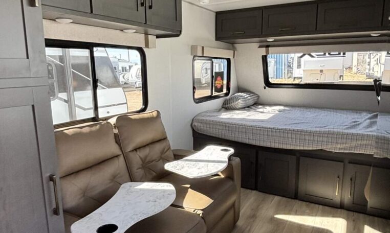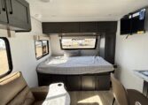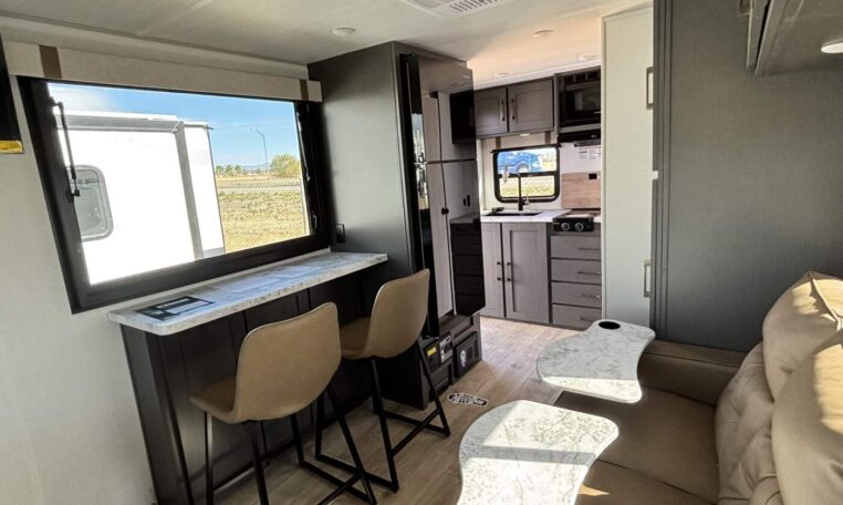 This trailer measures just 21′ 8″ long with a dry weight of about 4,088 lbs and a GVWR of 5,585 lbs, making it easy to tow with many SUVs and mid-size trucks. It comfortably sleeps up to three people, and its thoughtful layout maximizes usable space while maintaining a cozy, efficient feel.