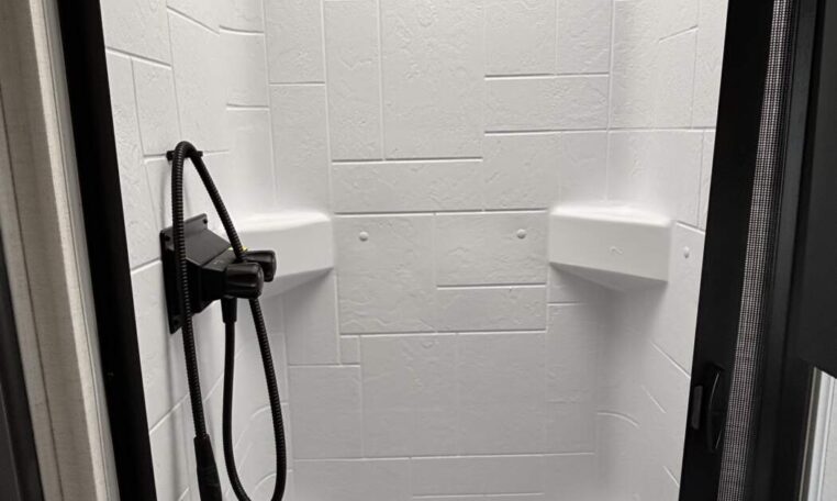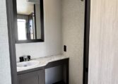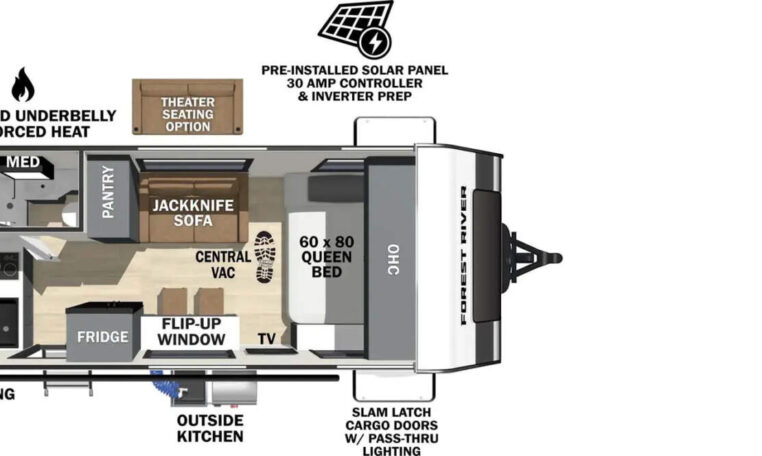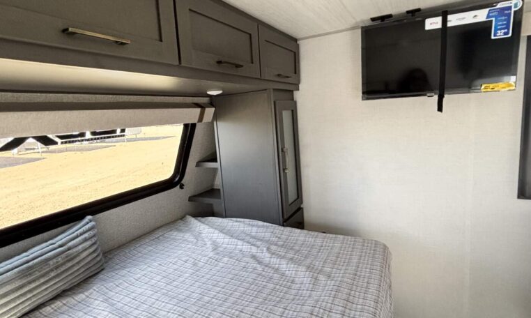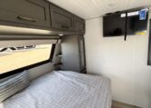 Inside, you’ll find a well-appointed living space that includes conveniences like a 60×80 residential queen bed, a spacious kitchen with modern fixtures, and comfort-enhancing amenities such as a 15,000 BTU air conditioner and a 12V TV. The interior offers plenty of storage and functionality for everyday camping and extended trips alike.